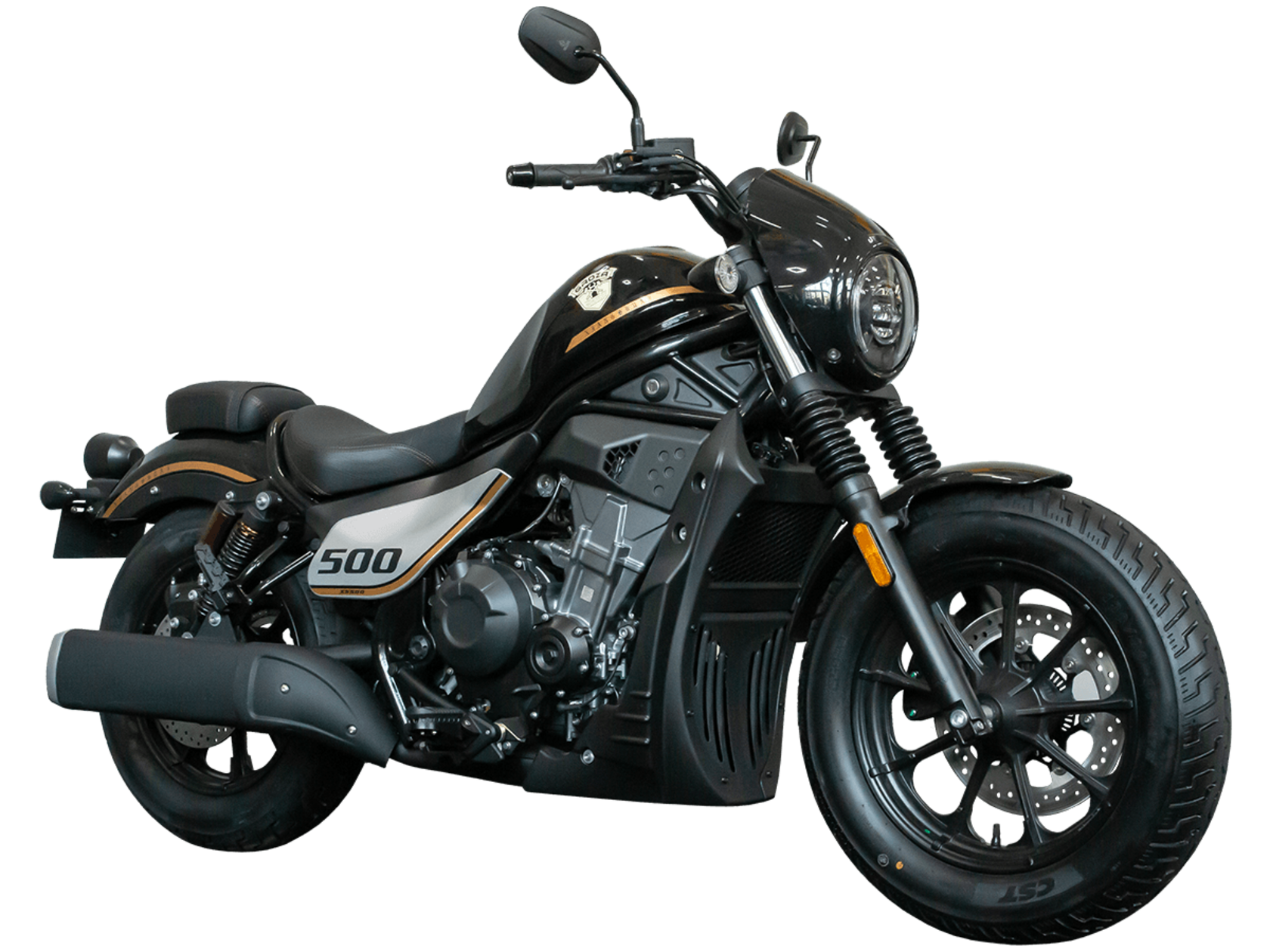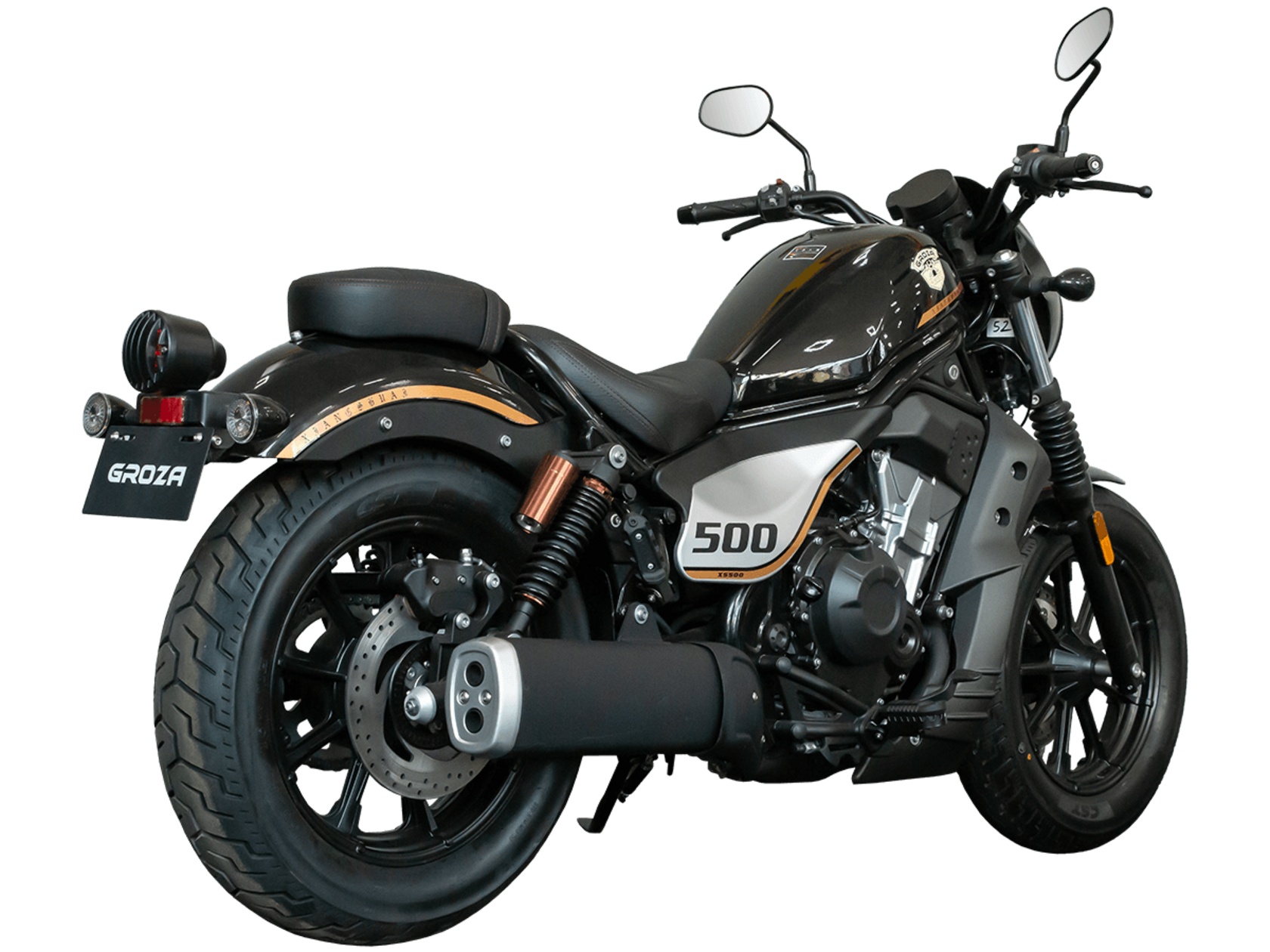 GROZA XS500 – великолепный лёгкий круизёр, идеальный как для езды по мегаполису, так и для поездок по загородным дорогам.Рядный двухцилиндровый четырёхтактный мотор объёмом 471 см3 выдаёт внушительные 48 л.с. и при высоких показателях динамики и отличном крутящем моменте способен разгонять аппарат до 160 км/ч. Инжекторный впрыск топлива с инжектором DELPHI увеличивает топливную экономичность, а также позволяет добиться высокой приёмистости и неприхотливости агрегата. Привод на ведущее колесо осуществляется ремнём знаменитой марки USA Gates. Жидкостная система охлаждения не допустит перегрева мотора даже при самом агрессивном вождении.На аппарат установлена 6-ступенчатая механическая коробка передач с классической схемой “1-N-2-3-4-5-6”. Мотоцикл оснащён литыми алюминиевыми дисками диаметром 16 дюймов. С неровностями дороги эффективно справляются телескопическая вилка спереди и два газонаполненных амортизатора сзади. Задние амортизаторы являются регулируемыми, что обеспечивает лёгкую перестройку на различные режимы езды. Эффективное и безопасное замедление с любых скоростей обеспечивают гидравлические дисковые тормоза с ABS спереди и сзади.Мотоцикл имеет множество привлекательных декоративных элементов в олдскул-стилистике, что делает его похожим на кастом-байк.XS500 сочетает в себе отличные технические характеристики, комфорт и надёжность, что позволяет вам ощутить настоящую свободу на любой дороге.