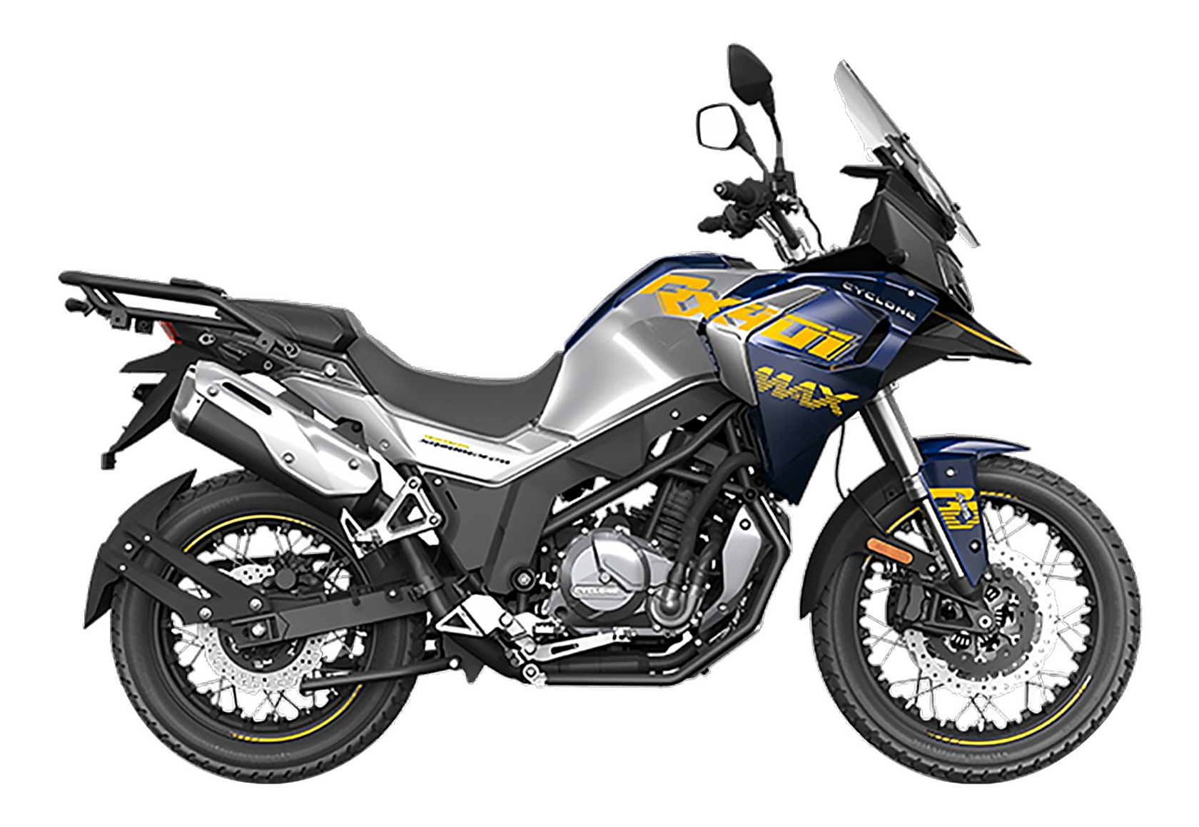 Мотоцикл CYCLONE RX401 2025 – туристический эндуро, готовый бросить вызов любым дорогам и расстояниям. За его рулём для вас не будет невозможных маршрутов!Оснащён рядным 2-цилиндровым 4-тактным двигателем DOHC объёмом 401 см³ с 4 клапанами на каждом цилиндре. Двигатель способен обеспечить мощность в 42,8 л.с. при 9500 об/мин, а максимальный крутящий момент 37 Н·м достигается на 8000 об/мин. Соотношение диаметра цилиндра и хода поршня 68х55,2 мм. Степень сжатия 11,6:1.Жидкостная система охлаждения не допустит перегрева двигателя даже при самом агрессивном вождении. Механическая коробка передач имеет 6 ступеней со схемой 1-N-2-3-4-5-6. Объём топливного бака 20 литров.Максимальная скорость мотоцикла 139 км/ч.Мотоцикл оснащён спицованными алюминиевыми колёсами диаметром 19 дюймов спереди и 17 сзади. Колёса обуты в бескамерные покрышки CST. В качестве передней подвески используется телескопическая вилка перевёрнутого типа, а сзади установлен маятник с моноамортизатором. Ход передней подвески 130 мм, задней – 55 мм. Оба компонента подвески регулируются. Для эффективного торможения используются гидравлические дисковые тормоза с 2-канальной ABS системой. Тормоза спереди представлены 2 тормозными дисками диаметром 305 мм с 4-поршневыми саппортами, а сзади расположен тормозной диск 258 мм с однопоршневым суппортом с плавающей скобой.Мотоцикл имеет продуманную конструкцию с высоко расположенным радиатором.Для освещения и сигнальных огней используется диодная светотехника. Данные от бортового компьютера выводятся на яркий цветной дисплей, оснащённый специальным козырьком для защиты от брызг и бликов. Имеются подсветка пультов, USB-порт, 12-вольтная розетка.Габариты 2160x860x1395 мм, снаряжённая масса 215 кг. Колёсная база 1410 мм, клиренс 185 мм, высота по седлу 810 мм.