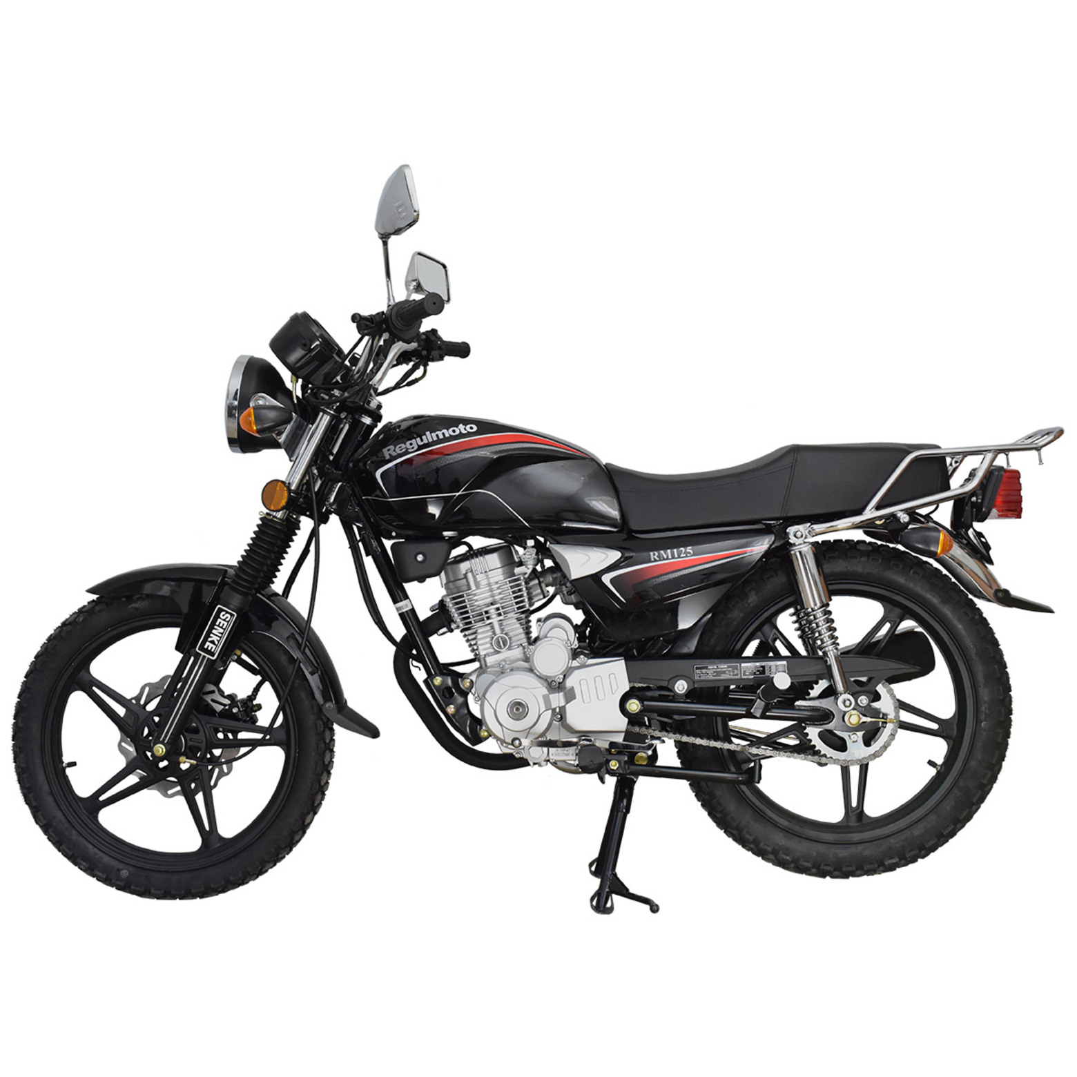 Regulmoto RM 125 – классический дорожный мотоцикл с надежным и экономичным двигателем небольшой кубатуры, который станет отличным выбором для повседневных поездок и утилитарного использования, как для начинающих, так и для опытных мотоциклистов.Мотоцикл Regulmoto RM 125 – популярная модель в ряду мототехники известного китайского производителя Senke, благодаря доступности и простоте эксплуатации заслужившая признание поклонников мототехники во всем мире. В раме байка с 18-дюймовыми колесами на легкосплавных дисках установлен одноцилиндровый 4-тактный двигатель с воздушным охлаждением рабочим объемом в 124 см3, способный развивать мощность 10,8 лошадиных сил. Подвеска мотоцикла представлена телескопической вилкой спереди и двумя амортизаторами сзади. Комфорт повседневного использования также обеспечивают электростартер, аналогово-цифровая приборная панель с замком зажигания, удобное сиденье, складные подножки пассажира, крепкий багажник, широкие крылья с брызговиками, центральная и стояночная подножка.За безопасность эксплуатации отвечают дисковый тормоз на переднем колесе и барабанный тормоз сзади. Regulmoto RM 125 оснащен полным комплектом оборудования, необходимого для передвижения по дорогам общего пользования: передние и задние поворотники, стоп-сигнал, фара головного света, на руле также установлены зеркала заднего вида. С мотоциклом Regulmoto RM 125 вы получите возможность не только оперативно решать повседневные дела – вы можете стать обладателем незаменимого помощника для утилитарных задач с доступной ценой и недорогим сервисным обслуживанием.У нас Вы можете купить этот мотоцикл с бесплатной доставкой по РФ и гарантией до года. Также его можно приобрести в рассрочку или в кредит.