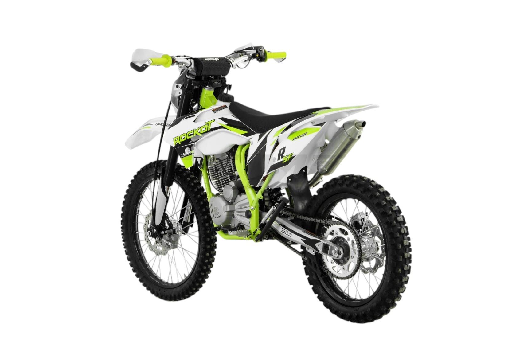 R5F Raptor 2.0 - популярная модель среднеразмерного эндуро мотоцикла в линейке марки ROCKOT, которая заслуженно занимает лидирующие позиции среди множества моделей данного класса и ценового сегмента. То, что из себя представляет модель R5F Raptor, является результатом многолетней работы инженеров завода, технических специалистов компании Rockot-Motors и обратной связи нескольких тысяч райдеров ,связавших свой мотоциклетный путь с данной моделью.ДизайнПоследнее обновление, связанное с дизайном версии 2.0, заключается в едином графическом оформлении всей линейки серии R5, которая значительно расширилась в 2024-2025 годах. R5F имеет все ту же цветовую гамму, состоящую из ярко-зеленого, черного и белого цветов. Как и прежде, мотоцикл имеет облицовочный пластик в стиле KTM 15`, который широко распространен в классе среднеразмерных эндуро. Рама окрашена в зеленый цвет, аналогичный расцветке графики. Двигатель, элементы передней и задней подвески окрашены в серебристый цвет, что гармонично сочетается с элементами белого пластика и ярко контрастирует с черными колесными дисками, траверсами и органами управления.РамаРама мотоцикла ROCKOT R5F Raptor 2.0 является его визитной карточкой, превознося мотоцикл в верх рейтинга среднеразмерных эндуро мотоциклов. Особенность рамы заключается в ее конструкции, которая имеет в передней части две цельные трубы, идущие от рулевой колонки до задней части, где крепится маятник задней подвески. Боковая часть рамы состоит из плоских труб с шестигранным сечением профиля. Именно это являлось одним из последних обновлений рамы. Также обновленная модель получила новую схему крепления боковой подножки, что сделало этот узел более надежным. Рама производится из хром-молибденового сплава стали, который является очень прочным и легким.ПодвескаПередняя и задняя подвеска имеют большой рабочий ход. В передней подвеске этого удалось достичь благодаря длине амортизаторов 830 мм, а сзади - благодаря системе подвески с рычагами прогрессии. Толщина рабочих штоков передних амортизаторов составляет 37 мм, что уже является стандартом для данного класса мотоциклов. Длина заднего амортизатора составляет 450 мм. Задний амортизатор имеет регулировки скорости отбоя и преднатяга пружины. Система рычагов прогрессии не только увеличивает рабочий ход задней подвески, но и делает работу передних и заднего амортизаторов более равномерной и прогнозируемой.КолесаЭндуро мотоцикл ROCKOT R5F Raptor 2.0 оснащается усиленными колесными дисками из легкого алюминиевого сплава. Спереди и сзади установлены шины с внедорожным протектором, размерностью 80/100-21 спереди и 100/90-18 сзади.Тормозная системаПередняя тормозная система состоит из вентилируемого тормозного диска диаметром 240 мм и двухпоршневого суппорта с фирменным тормозным цилиндром на руле. Сзади установлен тормозной диск того же диаметра и однопоршневый суппорт.ДополнительноВ базовой комплектации мотоцикл оснащен усиленным алюминиевым рулем переменного сечения 22/28. Рычаги переднего тормоза и сцепления под надежной армированной защитой с прочными эластичными щитками.
