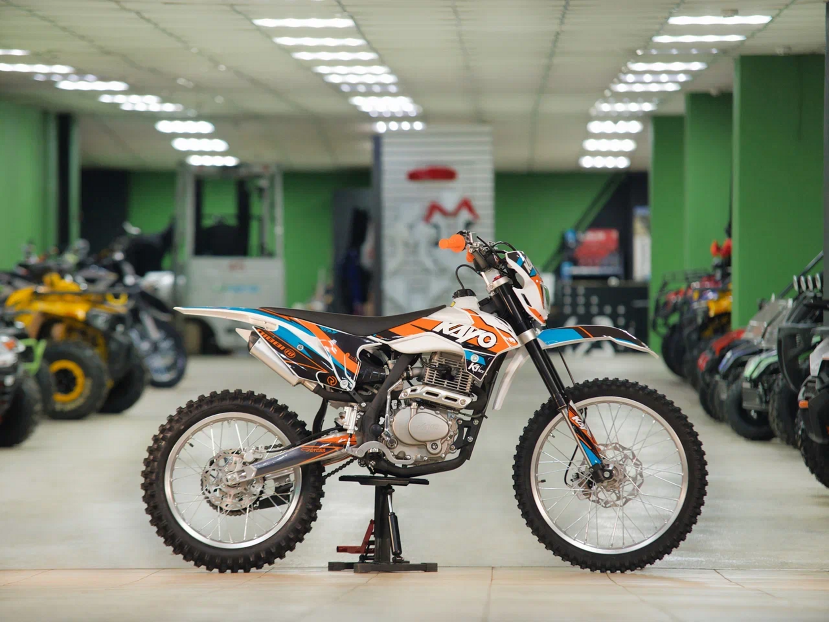 Кроссовый мотоцикл KAYO K1 250 MX – “народная” версия внедорожного мотоцикла от компании KAYO. Идеальный снаряд для внедорожного экстрима, представляющий собой оптимальный баланс производительности и технической оснащённости, поэтому он идеально подходит как новичкам, так и опытным райдерам. Удобный, простой и надёжный мотоцикл, который полностью оправдывает свою цену.Мотоцикл оснащён одноцилиндровым 4-тактным двигателем воздушного охлаждения (ZONGSHEN ZS172FMM) объёмом 249 см3, который обеспечивает высокую мощность (21 л.с.) и крутящий момент, что позволяет развивать большую скорость и с лёгкостью преодолевать трассы со сложным рельефом. Карбюраторная система подачи топлива с карбюратором NIBBI PE30 обеспечивает бесперебойную работу техники в самых жёстких условиях эксплуатации, простоту и лёгкость в обслуживании, а также неприхотливость к качеству топлива. Аппарат оснащён 5-ступенчатой механической коробкой передач с классической схемой “1-N-2-3-4-5”.Усиленная рама из хром-молибденового сплава и подвеска позволяют эффективно амортизировать удары при езде по неровностям и препятствиям на трассе. Передняя подвеска телескопическая вилка перевёрнутого типа от фирмы KKE длиной 800 мм, задняя — нерегулируемый моноамортизатор 360 мм, рассчитанный на высокие нагрузки до 900 LBS, также произведённый компанией KKE. Мотоцикл оснащён классическими спицованными колёсами диаметром 18 и 21 дюйм. Колёса имеют усиленные обода из алюминиевого сплава и буксаторы. Эффективное и безопасное замедление с любых скоростей обеспечивают гидравлические дисковые тормоза.Мотоцикл достаточно компактен и имеет вес всего в 105 кг, поэтому он комфортен в эксплуатации одновременно и для мужчин среднего телосложения, и для девушек. Аппарат оснащён системой запуска двигателя при помощи кнопки электростартера или при помощи рычага кик-стартера.Высококачественная износостойкая резина с развитым протектором отлично держит дорогу на различных типах покрытия и в самых разных поворотах. Сиденье эргономичной формы покрыто антискользящим материалом.K1 250 MX сочетает в себе отличные технические характеристики, комфорт и надёжность, что позволяет вам ощутить настоящую свободу на любой трассе