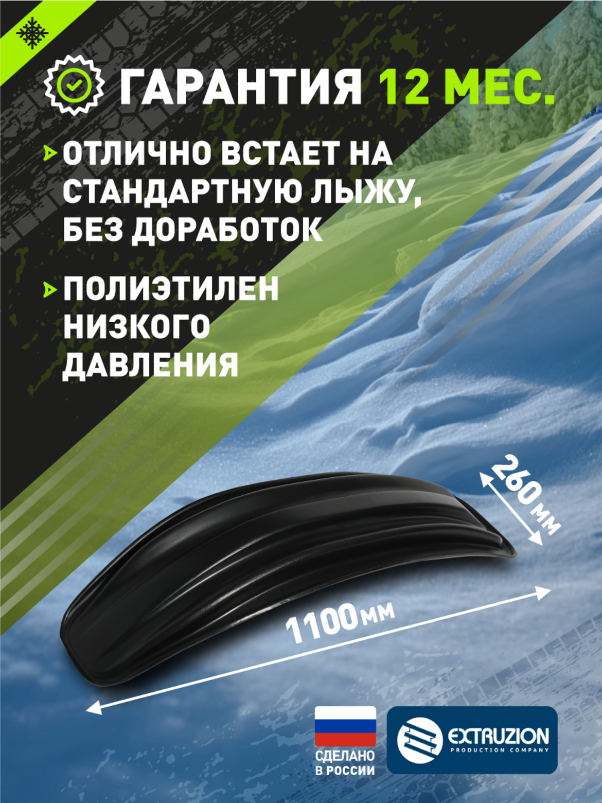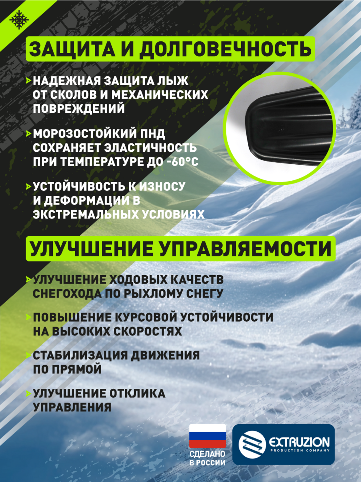 • Специализированная накладка на лыжи для снегоходов «Тайга» и «Русская механика». Разработана для повышения проходимости и защиты стандартных лыж от износа и повреждений. Обеспечивает улучшение ходовых качеств и повышенную плавучесть в глубоком снегу.