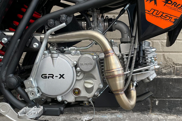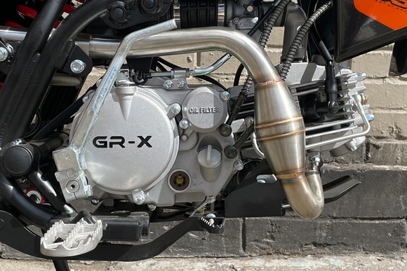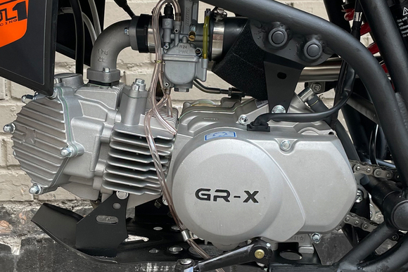 Питбайк GR-X YX125EM на колесах 19/16 дюймов – новый аппарат в линейке мотоциклов GR, хорошо знакомых любителем внедорожного экстрима. Этот мини-байк отличают отличная управляемость, небольшой вес и первоклассный внешний вид. В основе конструкции мини-байка – пространственная рама, разработанная специалистами компании для новой линейки мототехники, которая отлично подготовлена к любым нагрузкам на бездорожье. В качестве силового агрегата у этой модели используется популярный 4-тактный мотор «кабовского» семейства YX125EM – с 4-ступенчатой коробкой передач, электростартером и кик-стартером. С карбюратором NIBBI PE19 (с фильтр-боксом) номинал выдаваемой мощности составляет 9 лошадиных сил.Подвеска питбайка собрана на проверенных временем и практикой комплектующих: спереди телескопическая вилка перевернутого типа, сзади – маятник с моноамортизатором. Регулировка амортизаторов отсутствуют (только сзади можно настроить преднатяг пружины), но подвеска легко справляется с подавляющим большинством задач.В стоковую комплектацию питбайка входят мощная светодиодная фара, откидывающие рычаги сцепления и тормоза, защищенные от попадания влаги кнопки, ручка газа NIBBI, крепкий руль переменного сечения ProTaper, прочный и гибкий пластик, защита двигателя, защита перьев вилки и моноамортизатора, буксаторы на колесах с кроссовой резиной.В сравнении с обычным питбайком GR-X обладает более длинной колесной базой и большей высотой по седлу, что делает эту модель максимальной комфортной как для райдеров среднего роста, так и для рослых фанатов офф-роада.