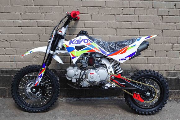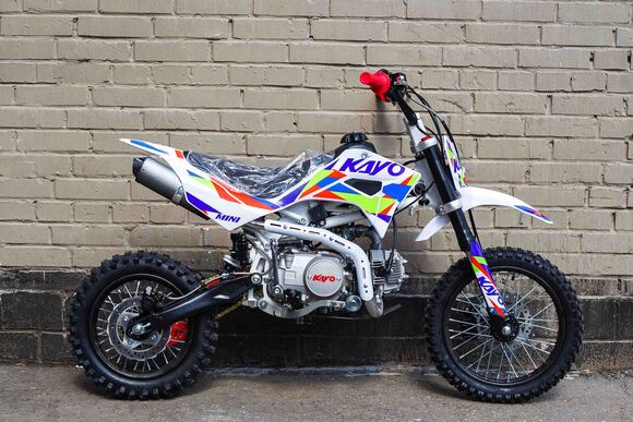 Питбайк KAYO Mini К125EM 14/12 – идеальный снаряд для юных экстремалов, который можно использовать на лёгких кроссовых трассах и дорогах с различным покрытием. Подходит для детей от 10 лет, желающих освоить технику езды на внедорожном мотоцикле. Удобный, простой и надёжный мотоцикл, который полностью оправдывает свою цену.Одноцилиндровый 4-тактный двигатель воздушного охлаждения производства KAYO объёмом 125 см3, выдаёт 9 л.с. Карбюратор NIBBI PE19 обеспечивает бесперебойную работу техники в самых жёстких условиях эксплуатации, простоту и лёгкость в обслуживании, а также неприхотливость к качеству топлива. Питбайк оснащён механической 4-ступенчатой коробкой передач с формулой “N-1-2-3-4”.Аппарат имеет вес всего 70 кг. Усиленная рама из хром-молибденового сплава и подвеска позволяют эффективно амортизировать удары при езде по неровностям и препятствиям на трассе. Передняя подвеска —телескопическая вилка длиной 625 мм, задняя —моноамортизатор 280 мм. Рама и пластик разработаны фирмой KAYO. Мотоцикл оснащён классическими стальными спицованными колёсами диаметром 14 дюймов спереди и 12 дюймов сзади. Эффективное и безопасное замедление с любых скоростей обеспечивают гидравлические дисковые тормоза марки HSK.Высококачественная износостойкая резина с развитым протектором отлично держит дорогу на различных типах покрытия. Аппарат оснащён системой запуска двигателя при помощи кнопки электростартера или при помощи рычага кик-стартера.Если вы ищете послушный, компактный, шустрый, красивый питбайк для своего малыша, считайте, что вы его нашли. Это один из лучших мотоциклов для обучения и первых шагов в эндуро и мотокроссе. Он отлично подойдёт как для гонок на трассе, так и для покатушек по пересечённой местности.