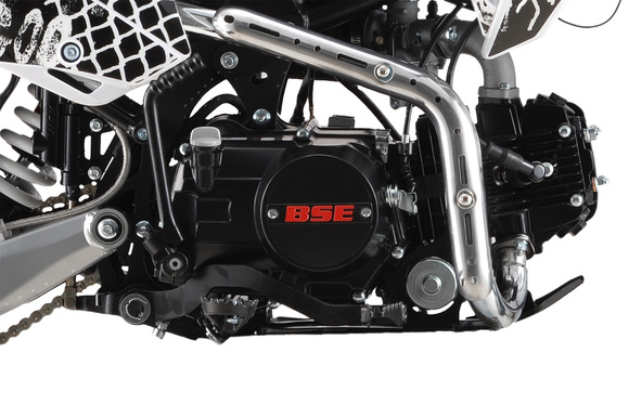 Питбайк BSE EX 125E MAX13 1.0 14/12 предназначен для активной и увлекательной езды на мотокроссах и отличается от аналогов в своем классе не только качеством, но и эксклюзивным дизайном от современного граффити-художника Max13 (Макс Торопов). Базой для этой модели стали шасси DX125, доказавшие надежность конструкции. На хроммолибденовой раме установлен 125-кубовый мотор Zonghshen, который производит максимально 10 л.с. Комбинируется он с простым в обслуживании и настройке карбюратором MIKUNI VM22, воздушным охлаждением и двумя типами запуска: кик- и электростартер.Мотоцикл получил также дисковые тормоза Mojo Racing с гидравлическим приводом и энергоемкую подвеску с вилкой-телескопом перевернутого типа. Дополненная усиленными колесными дисками и траверсами CNC комплектация наилучшим образом преодолевает неровности дороги. Для поездок в темное время суток востребованной станет мощная светодиодная фара.